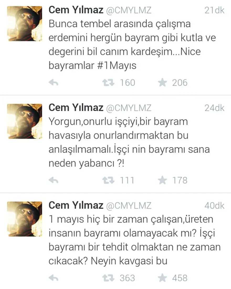 Ünlü komedyen Cem Yılmaz, 1 Mayıs Emek ve Dayanışma Günü nedeniyle Twitter hesabından takipçileriyle bazı tweet'ler paylaştı.