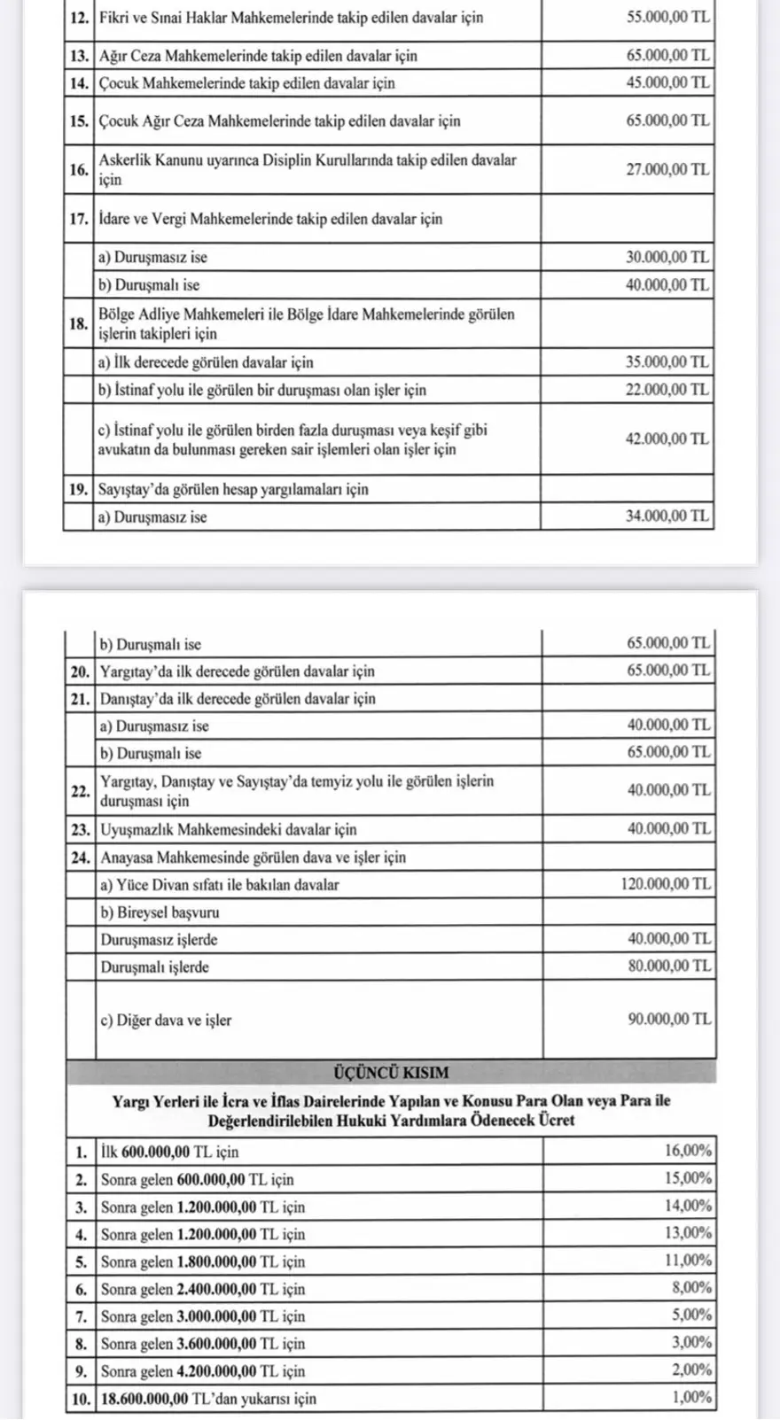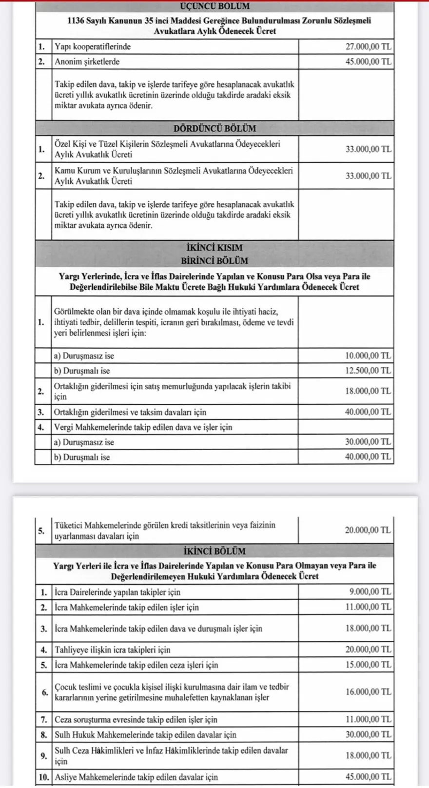 Yayımlanan tarifeye göre kamu kurum ve kuruluşlarıyla özel ve tüzel kişilerin sözleşmeli avukatlarına ödeyecekleri ücret en az 33 bin TL, dava ücretleri ise 9 bin TL ile 120 bin TL arasında olacak.