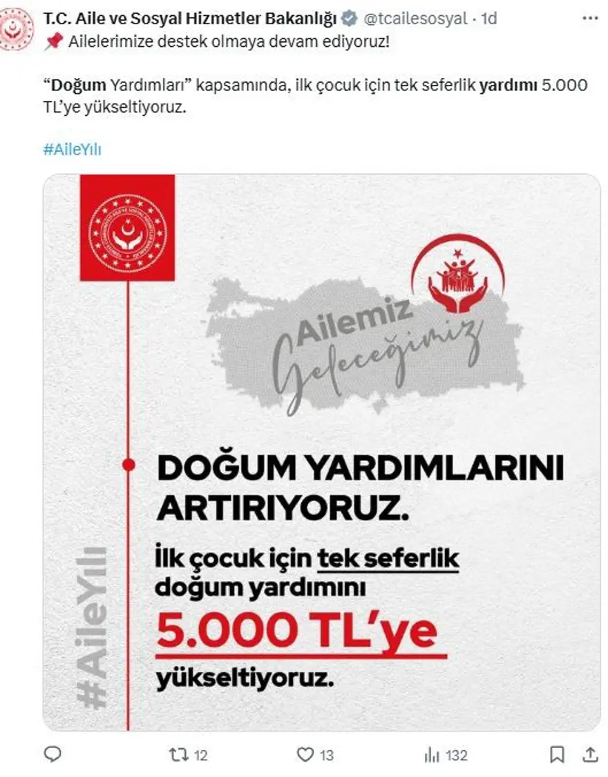 "Yeni doğacak ilk çocuk için verdiğimiz tek seferlik doğum yardımını 5 bin liraya yükseltiyoruz. İkinci çocuk için her ay 1500 lira; 3'üncü ve sonraki çocuklar için de her ay 5 bin lira olacak şekilde çocuk yardımlarını devreye alıyoruz. İkinci ve sonraki çocuklar için hiçbir bir şart gözetmeksizin vereceğimiz çocuk yardımlarını her ay annelerimizin hesabına yatıracağız. Bu müjdemizin de ailelerimize hayırlı-uğurlu olmasını diliyorum." ifadelerini kullandı.