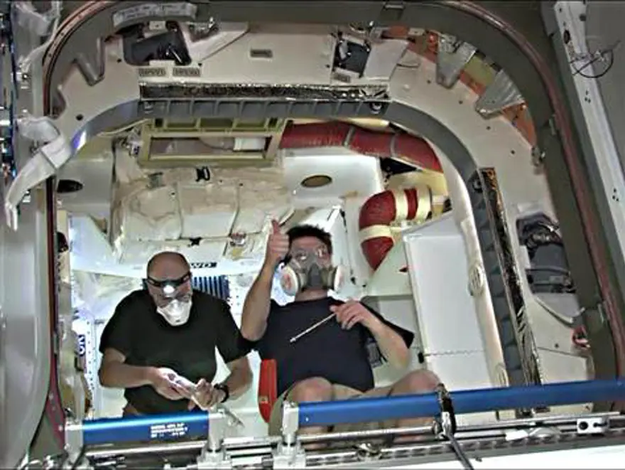ABD'li astronot Don Pettit (solda) ve ISS kumandanı Rus astronot Oleg Kononenko, Dragon'a giriş yapıyor.