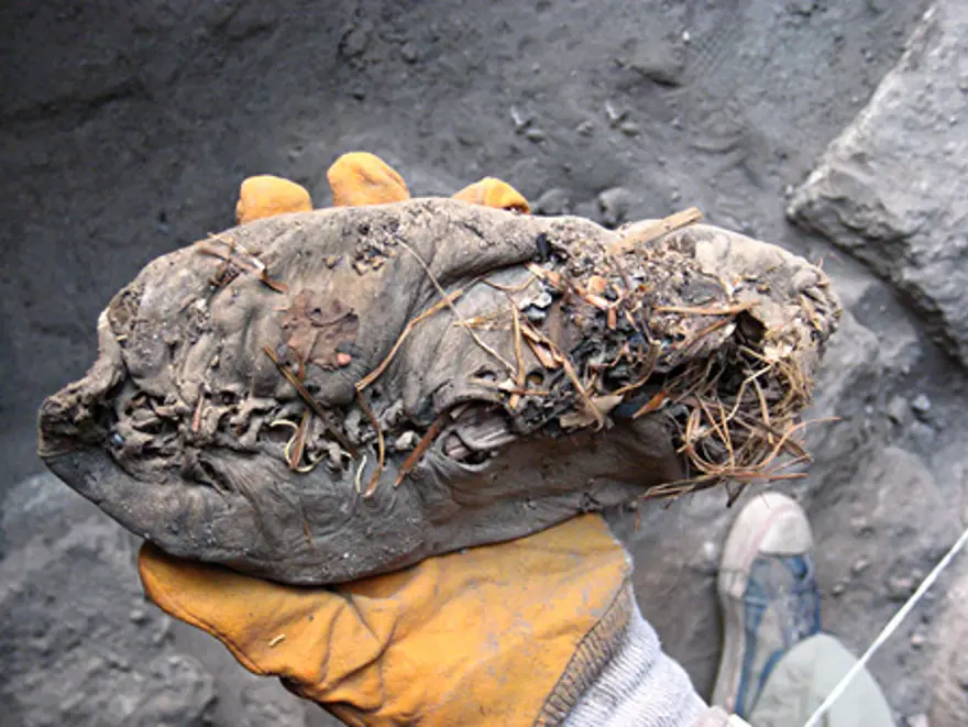 Tek bir parça deriden yapılan ve giyen kişinin ayağının formunu sararak alması için tasarlanan deri ayakkabı, içi kuru otla dolu vaziyette bulundu. Bilim adamları, makosenin içinin kuru otla ayağı sıcak tutması mı yoksa şeklinin korunması için mi doldurulduğunun bilinmediğini belirtti.