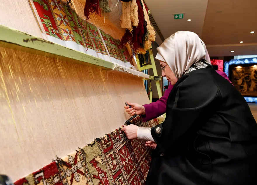 TİKAD'ın Hayata Bağlayan İlmekler Sergisi'nin açılışını yaparak, dokunan halılar hakkında bilgi alan Erdoğan, dünyanın bilinen ilk Türk halısı olan Pazırık halısının uyarlamasına, dokuma sanatçısı Raziye Başeğmez ile birlikte ilmek attı.