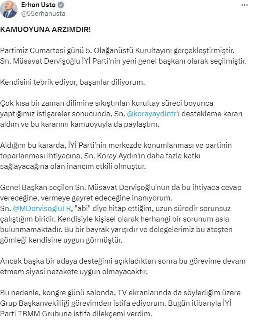Bu nedenle, kongre günü salonda, TV ekranlarında da söylediğim üzere Grup Başkanvekilliği görevimden istifa ediyorum. Bugün itibarıyla İYİ Parti TBMM Grubuna istifa dilekçemi verdim. Bu kararı ivedilikle açıklamamın nedeni; yeni kurulacak İYİ Parti grubunun önünü açmaktır. Göreve getirilecek arkadaşlarımıza şimdiden başarılar diliyorum."