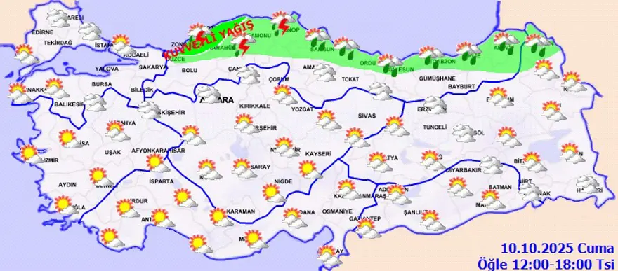 Batı Karadeniz (Bolu hariç), Orta ve Doğu kıyıları ile Sakarya'nın kıyı kesimleri, Artvin ve Ardahan çevreleri ile Batı Karadeniz civarında sağanak yağış bekleniyor. Düzce, Zonguldak ve Bartın çevrelerinde yağışların kuvvetli olacağını tahmin eden meteoroloji, bu iller için sarı kodlu uyarı yayınladı.