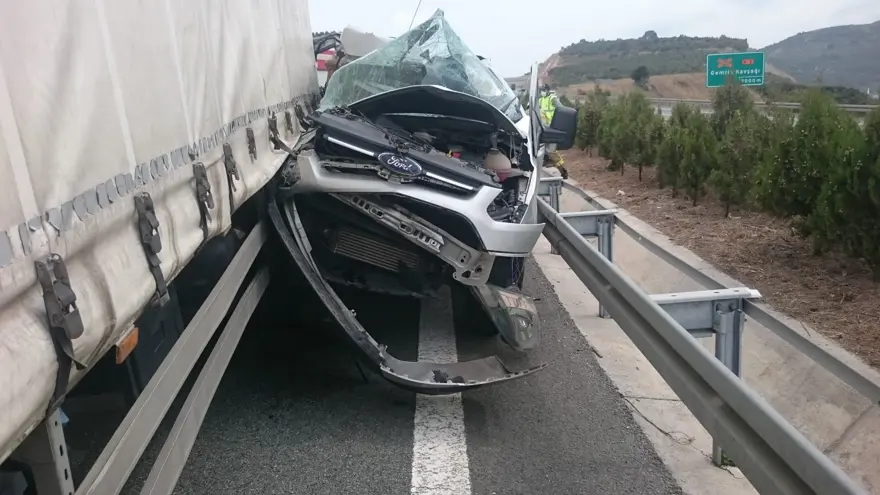 Araç çarptığı yan şeritteki kamyon ile bariyerler arasında sıkıştı. Hurdaya dönen aracın sürücüsü ise burnu bile kanamadan kurtuldu.