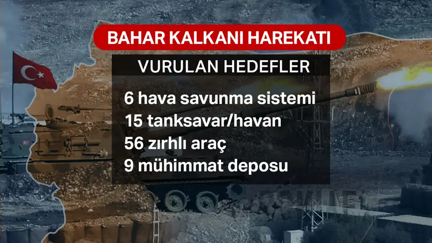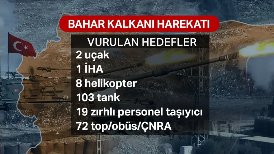 TSK, Suriye'de dördüncü harekatını başlattı. 34 şehidin verildiği İdlib'e düzenlenen harekatın adı; Bahar Kalkanı... Milli Savunma Bakanı Hulusi Akar, şu ana kadar 1 İHA, 8 helikopter, 103 tank, 72 top/obüs/ÇNRA, 3 hava savunma sistemi ve 2 bin 212 rejim askerinin etkisiz hale getirildiğini açıkladı. Öte yandan Milli Savunma Bakanlığı (MSB), İdlib'de, Türk uçaklarına taarruz eden rejime ait iki adet SU-24 tipi uçağın düşürüldüğünü duyurdu.