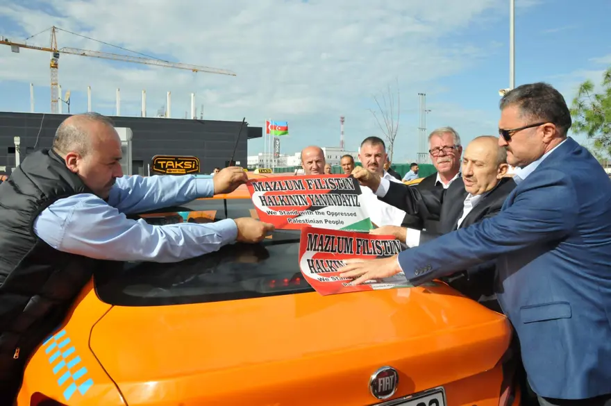 İstanbul Havalimanı Taksiciler Kooperatifi üyeleri, İsrail'in saldırdığı Gazze'ye destek için araçlarına "Mazlum Filistin halkının yanındayız" yazılı afişler yapıştırdı.