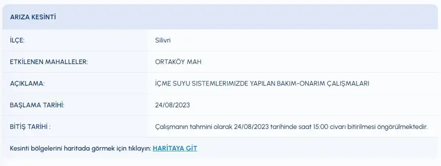İSKİ (İstanbul Su ve Kanalizasyon İdaresi) tarafından yayımlanan arıza-kesinti listesiyle birlikte, İstanbul'un 6 ilçesinde su kesintisi yaşanacağı duyuruldu. Kesintilerden etkilenen vatandaşlar, su kesintisinin sona ereceği saati araştırıyor.