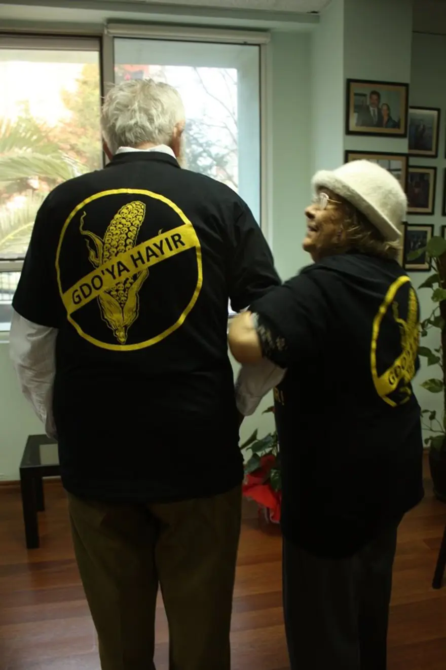 Üzerlerinde "Soframda, tarlamda, ülkemde GDO istemiyorum. GDO'ya Hayır" yazılı tişörtleri son olarak TEMA Vakfı kurucusu Hayrettin Karaca ve Muazzez İlmiye Çığ giydi.