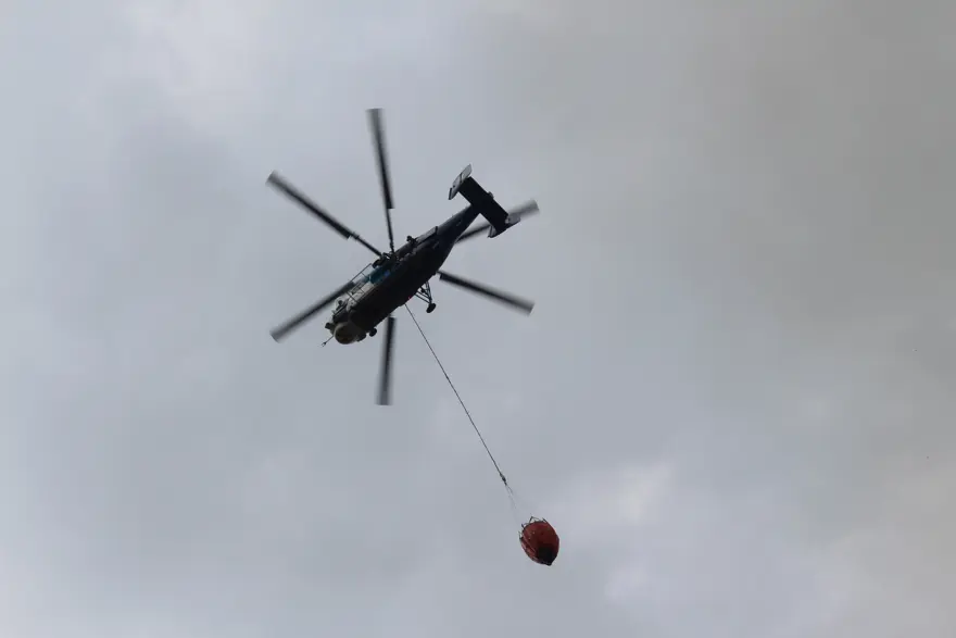 Yangın söndürme çalışmalarına helikopter de destek verdi.