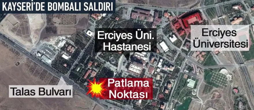 Erciyes Üniversitesi yerleşkesinin Talas istikametindeki giriş kapısı yakınında bomba yüklü bir otomobil, saat 08.45'te halk otobüsünün yanında infilak etti.