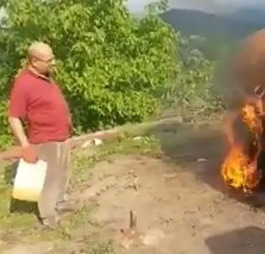 Lastiğin üzerine benzin döken Uğur, ateşe verdi.