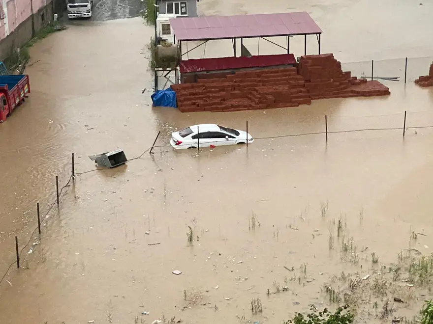 Şiddetli yağışın etkilediği Pazar ilçesinde de su taşkınları nedeniyle bazı araçlar su altında kaldı, çok sayıda iş yerini su bastı.