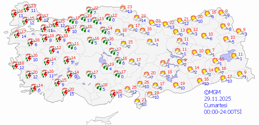 Meteoroloji Genel Müdürlüğü'nün (MGM) tahminlerine göre bugün Kıyı Ege ile Manisa, Edirne, Kırklareli ve Antalya çevrelerine sağanak yağış geliyor.