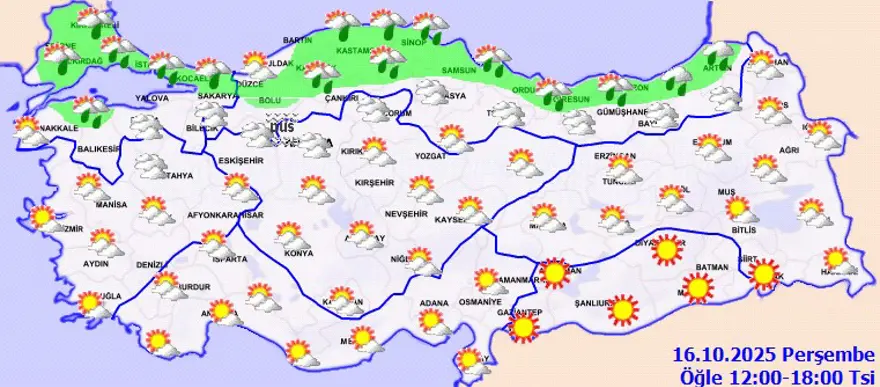 Meteoroloji Genel Müdürlüğü'nün (MGM) verilerine göre yurdun kuzey kesimlerinde sağanak, Marmara'nın güneyi, Ege ve Karadeniz'de ise sis ve pus görülecek.