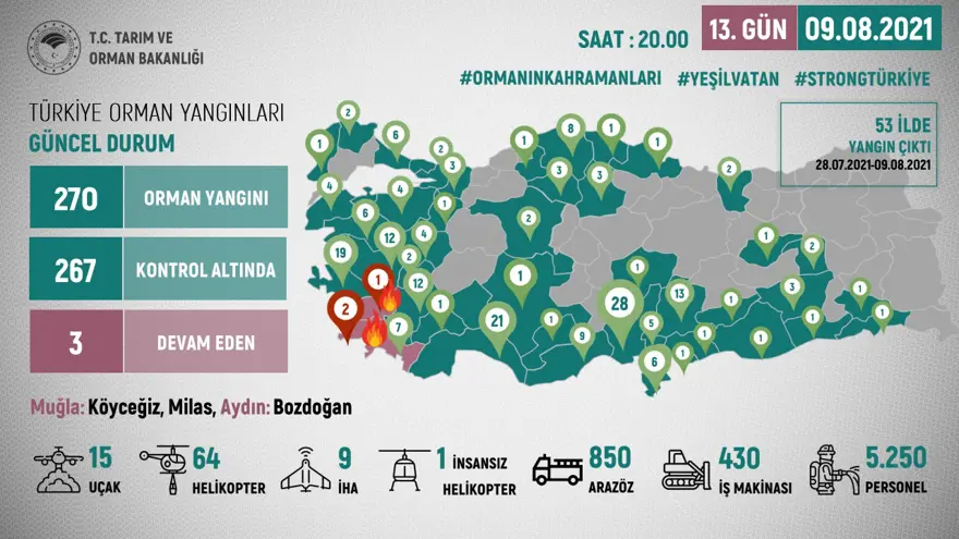 270 orman yangınıyla uğraştık, 267'si kontrol altında. Üç orman yangını için çalışmalar devam ediyor.