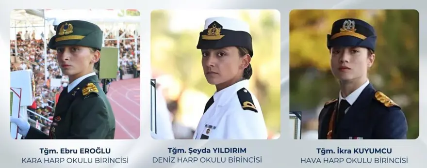 Ankara'da Kara Harp Okulu'nda, Teğmen Ebru Eroğlu, İstanbul'da Deniz Harp Okulu'nda Teğmen Şeyda Yıldırım ve Hava Harp Okulu'nda Teğmen İkra Kuyumcu dönemlerini birinci bitirdi. Birinci kızlar, diplomalarını Cumhurbaşkanı Recep Tayyip Erdoğan'dan aldı.