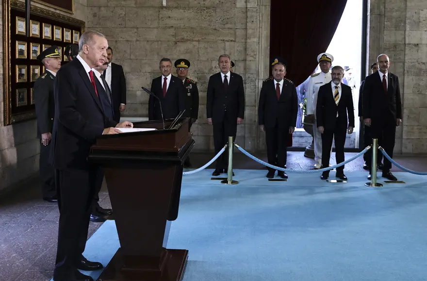 Erdoğan başkanlığındaki heyet, mozoleye çıkan merdivenin önünde fotoğraf çektirdikten sonra Misak-ı Milli Kulesi'ne geçti. Burada Anıtkabir Özel Defteri'ni imzalayan Cumhurbaşkanı Erdoğan, deftere şunları yazdı: