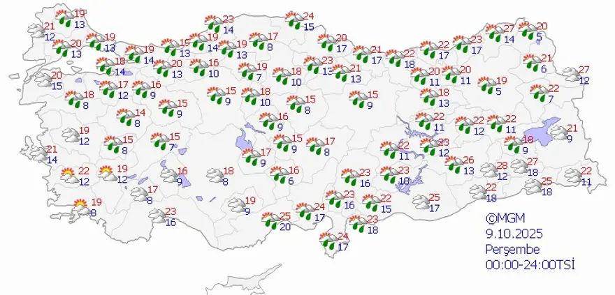 Kıyı Ege, Batı Karadeniz kıyıları, İstanbul, Kocaeli, Yalova, Bursa, Samsun ve Rize çevreleri, Ordu'nun, Giresun'un ve Trabzon'nun iç kesimleri ile Artvin'in kıyı kesimlerinde yağmur bekleniyor.