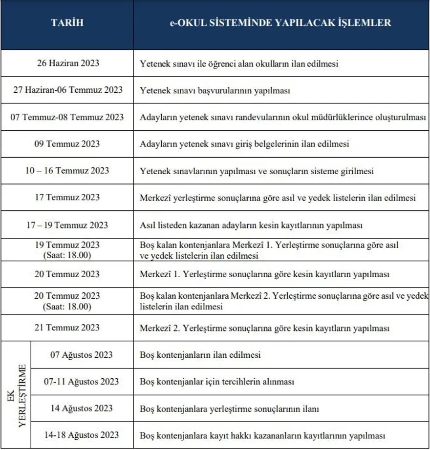 Yetenek sınavı için başvurular, e-Okul üzerinden kılavuzda belirtilen takvim çerçevesinde gerçekleştirilecektir." denildi.