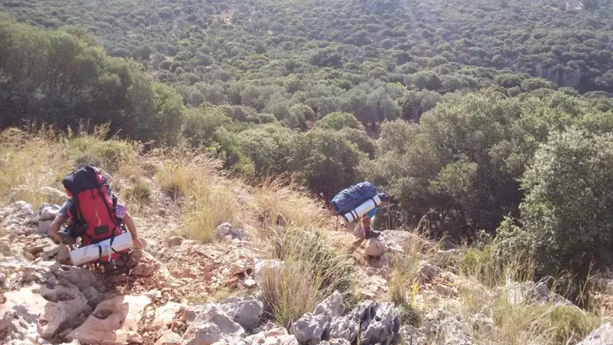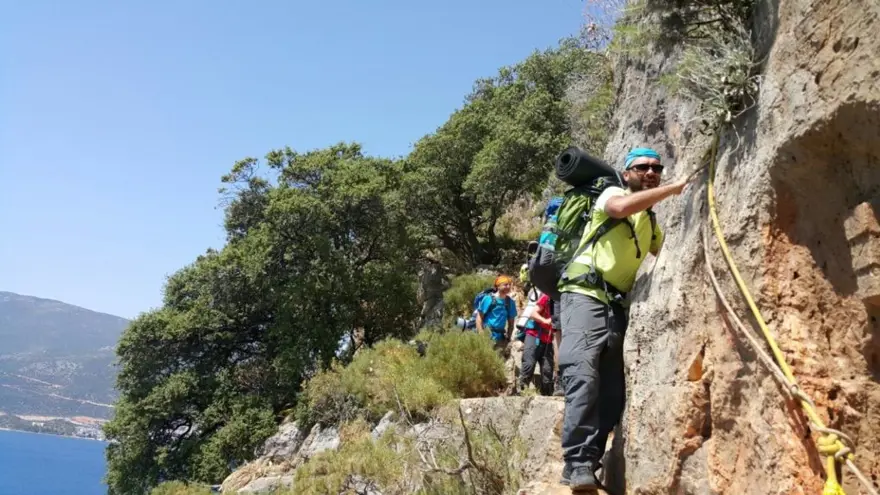 Ancak birçoğumuzun ortalama 15 kg gelen sırt çantaları ile ilk imtihanı olduğu için henüz daha ilk kilometrelerde özellikle omuzlarımız ciddi bir şekilde acımaya başladı. Neyse ki daha önce bizi bu yönde uyardıkları için fazla üzerinde durmadık ve yola devam ettik. Limanağzı’na yaklaşırken ilk sürprizimizle karşılaştık. Çantaları bırakıp aşağı inilmesi gereken kayalar, daracık geçişler ve nihayetinde sadece ipe tutunarak geçilebilen bir bölge.