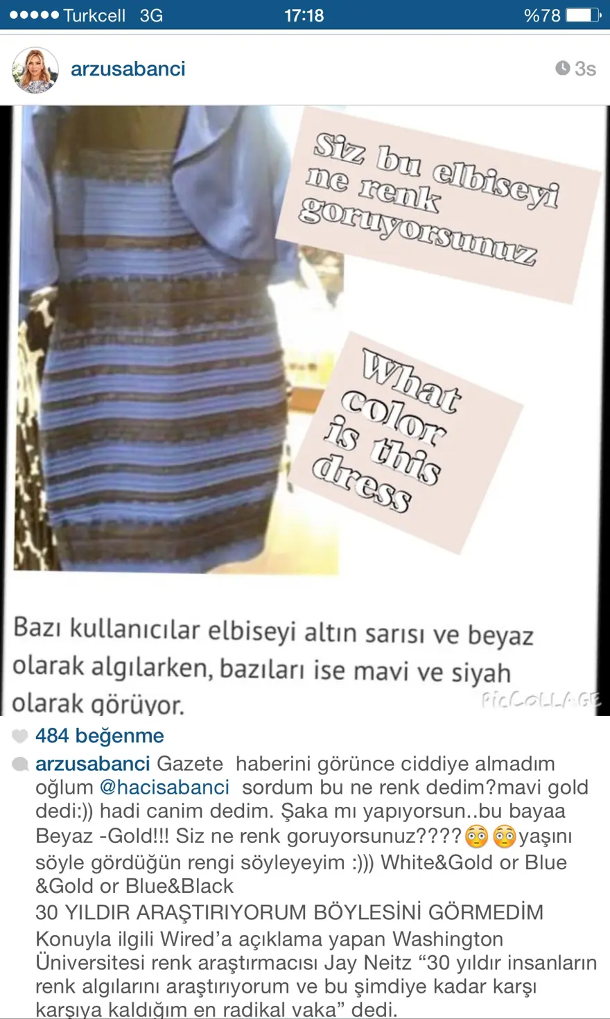 Arzu Sabancı, Türkiye’de de kısa sürede paylaşım rekorları kıran kareyi kişisel sosyal medya hesabından paylaştı. Elbisenin rengi hakkında oğlu Hacı Sabancı ile aynı görüşte olmadıklarını belirten Sabancı, bu durumun yaş farkından kaynaklandığını iddia etti.