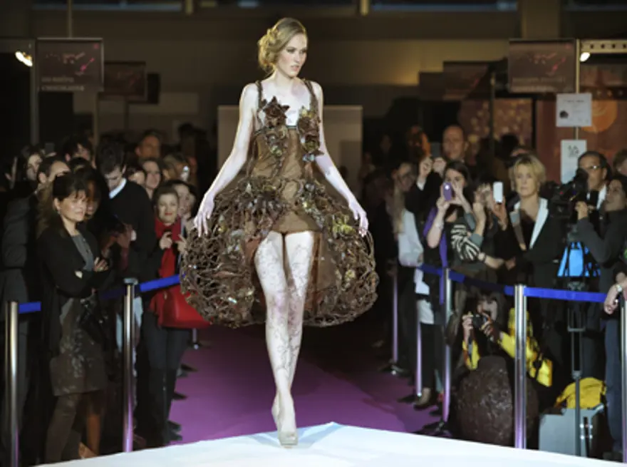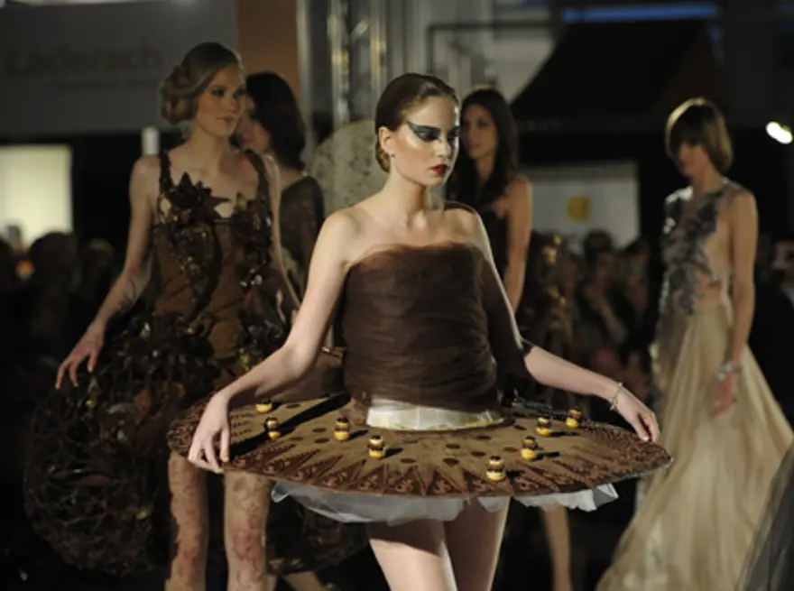 Geçtiğimiz Perşembe günü yapılan çikolata moda şovda mankenler çikolatadan yapılmış giysiler ve aksesuarlarla podyuma çıktılar.