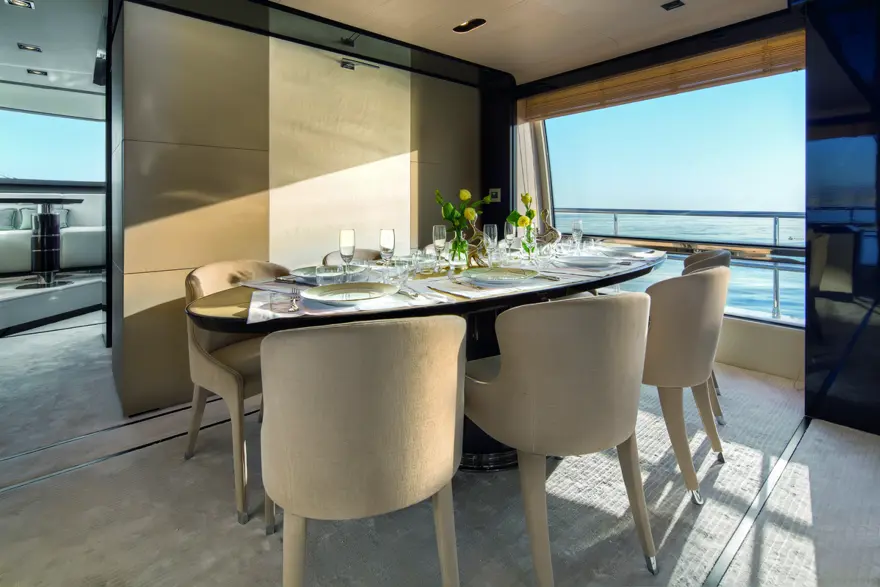 Yeni Azimut 80’in en önemli özelliklerinden biri, bol ışıklı bir atmosfere sahip olması. Bunu sağlayan pek çok faktör var. Yaklaşık iki metreyi bulan tavan yüksekliği, yerden tavana uzanan panoramik pencereler, LED teknolojisine dayalı aydınlatma sistemi, açık renklerde tercih edilen minimalits mobilyalar ve bol bol ayna kullanımı yatın ışıklı bir ortama kavuşmasına yardımcı oluyor.