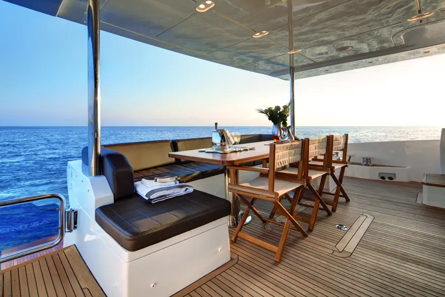 Yüzme platformu oldukça geniş, 9 metrekare. Burada dört kişinin rahatlıkla güneşlenebileceği bir alan ve C şeklinde geniş bir dinlenme koltuğu yer alıyor. 4 metre uzunluğundaki tender’lar ve jet ski’ler de buradan denize indiriliyor.