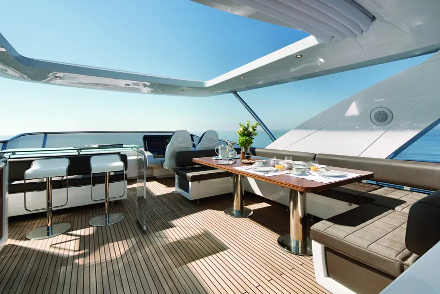 42 metrekarelik flybridge ise gün boyu sosyalleşmek isteyenler düşünülerek tasarlanmış. Büyük bir L koltuk, Miele ürünleriyle döşeli bir mutfak, bar, barbekü ve 42 inç TV yer alıyor.