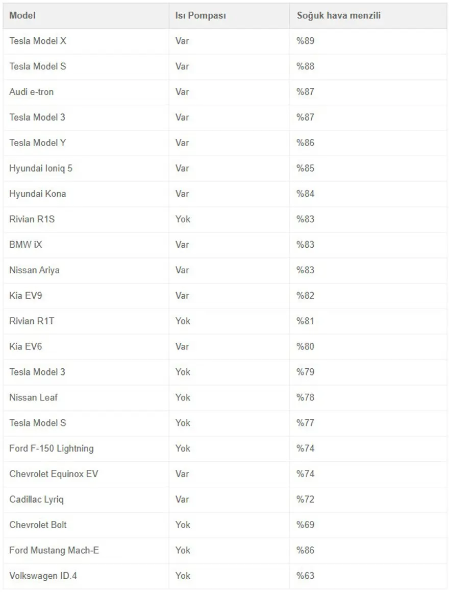ABD merkezli Recurrent adlı şirket 18 binden fazla elektrikli aracın verilerini değerlendirdi. Araştırma, dondurucu soğuklarda model model elektrikli araçların performansını ortaya koydu.