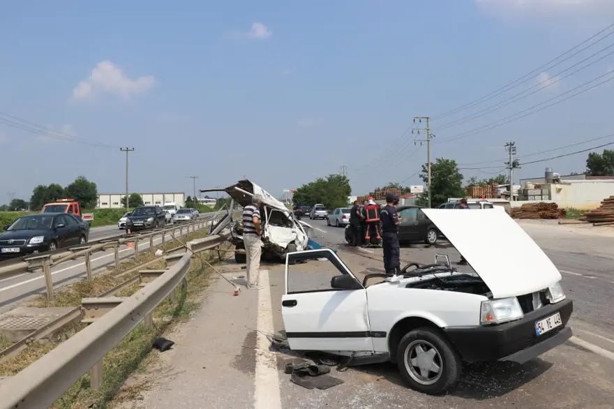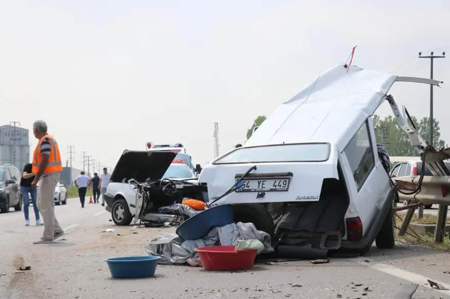 Sakarya'nın Erenler ilçesi D-100 Karayolu'nda iki otomobilin çarpışması sonucu meydana gelen trafik kazasında, bir otomobil ortadan ikiye bölündü. Can kaybının kaydedilmediği kazada 6 kişi yaralandı. Kazazedelere, sıcaktan etkilenmemeleri nedeniyle şemsiye açılması dikkat çekti.